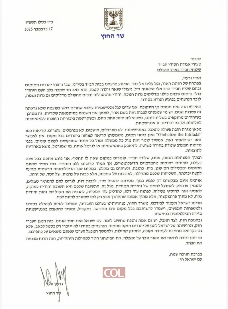 במכתבו כתב שר החוץ כי “בשבת חג החנוכה האור נפל עלינו צל כבד”, והדגיש כי הפיגוע הרצחני הוא מתקפה ישירה על ערכי החיים, החירות והאמונה. לדבריו, שלוחי חב״ד מהווים סמל למסירות נפש ולהפצת אור התורה והיהדות ברחבי העולם, גם ברגעים הקשים ביותר.