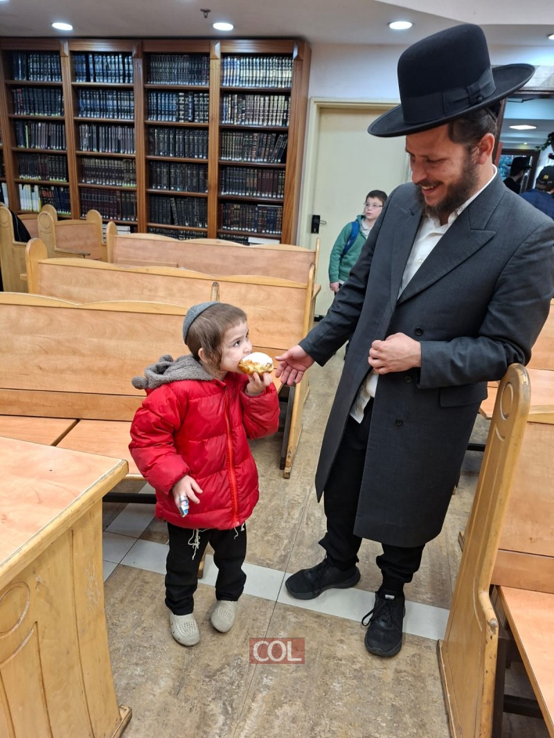האירוע נחתם בשירה חסידית מרוממת ובחלוקת סופגנייה חמה ומתוקה לכל ילד.
