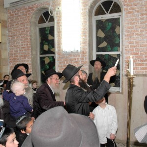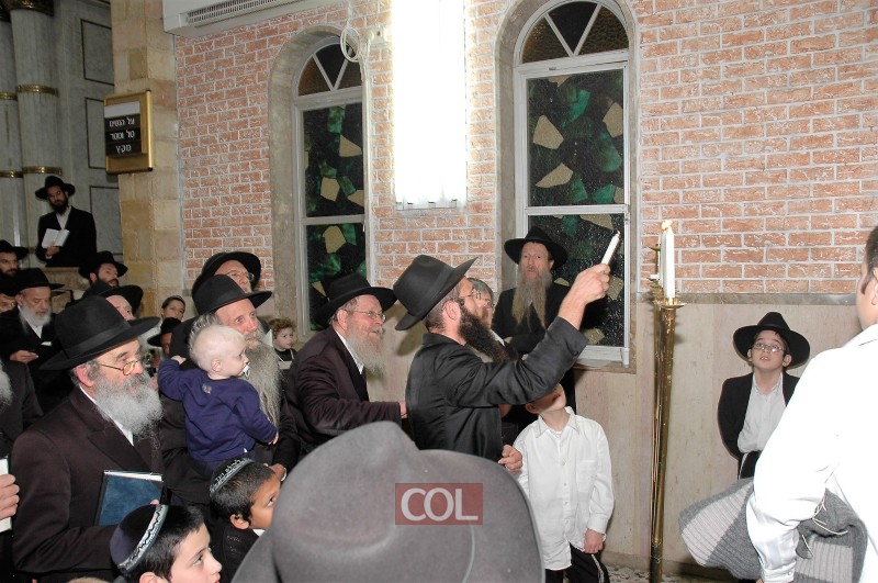 הדלקת נרות חנוכה בבית הכנסת 'בית מנחם' בכפר חב"ד, בשנת תשס"ב