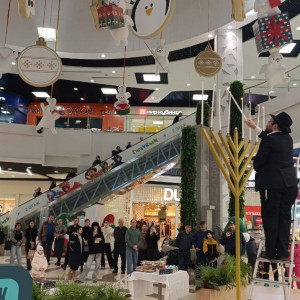 אל מול סממני חגם: הרב זלמן שמעון דערן, שליח הרבי ורב שכונת נובי-וועשקי במוסקבה, בהדלקת נר החנוכה השמיני במרכז הקניון הגדול של נובי וועשקי