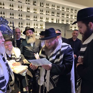 ראש ישיבות חב"ד באור יהודה - הרב שלום דובער הנדל, באמירת הברכות בברית המילה לבן ר' שלום דובער זילברשטרום מצוות הישיבה. בסנדקאות כובד הסבא-רבה, הרב אליהו פרץ זילברשטרום (צילום: מענדי קורנט)