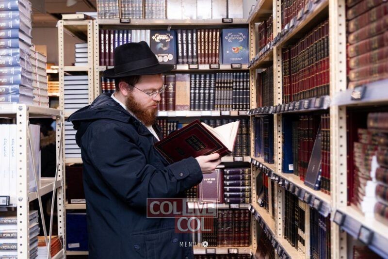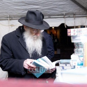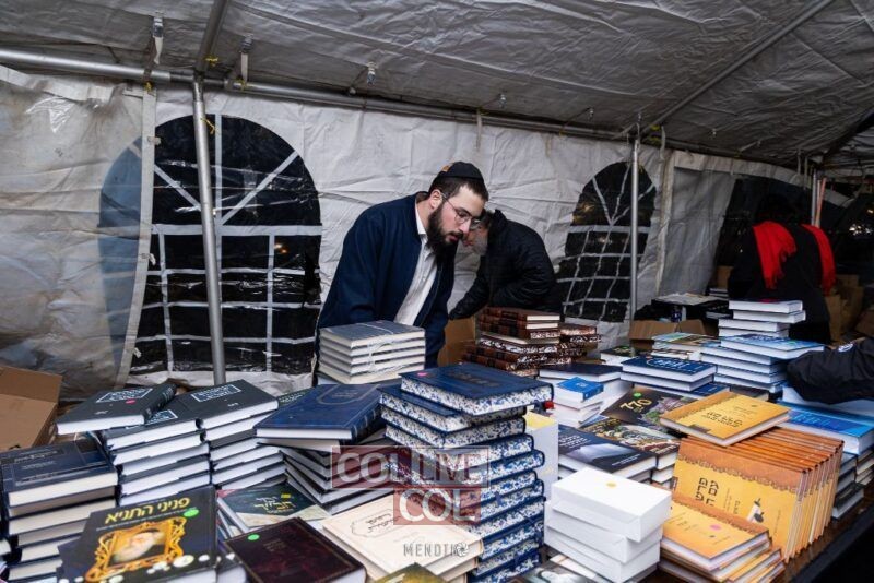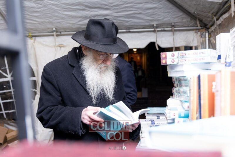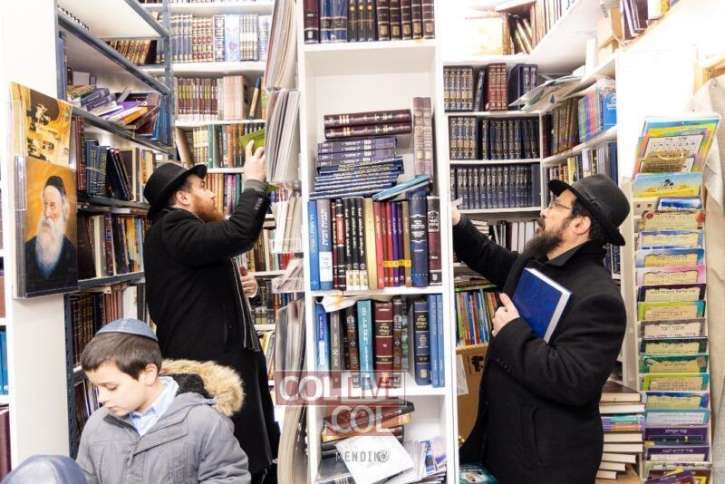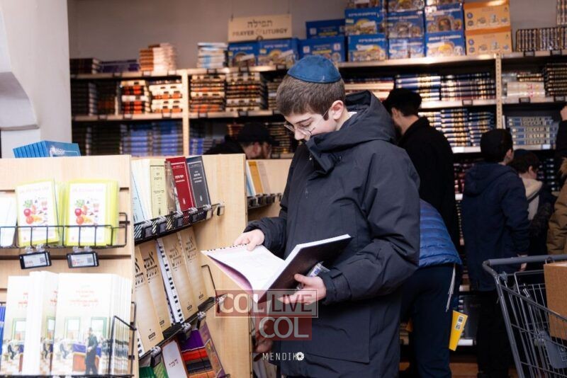 המשפיע הרב נחמן שפירא מקראון הייטס רוכש ספרים לרגל ה' בטבת, לצדם של אנ"ש חסידי חב"ד, שנהרו מבוקר ועד לילה בחג 'דידן נצח' אל קה"ת וחנויות היודאיקה, לרכוש ספרים לביתם (צילום: מנדי קריאף)