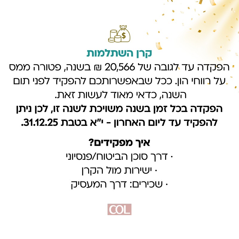 הפקדה עד לגובה של 20,566₪ בשנה, פטורה ממס על רווחי הון. ככל שבאפשרותכם להפקיד לפני תום השנה, כדאי מאוד לעשות זאת. הפקדה בכל זמן בשנה משויכת לשנה זו, לכן ניתן להפקיד עד ליום האחרון - י"א בטבת 31.12.25.