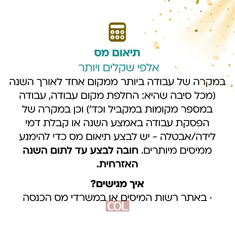 במקרה של עבודה ביותר ממקום אחד לאורך השנה (מכל סיבה שהיא: החלפת מקום עבודה, עבודה במספר מקומות במקביל וכד') וכן במקרה של הפסקת עבודה באמצע השנה או קבלת דמי לידה/אבטלה - יש לבצע תיאום מס כדי להימנע ממיסים מיותרים. חובה לבצע עד לתום השנה האזרחית.