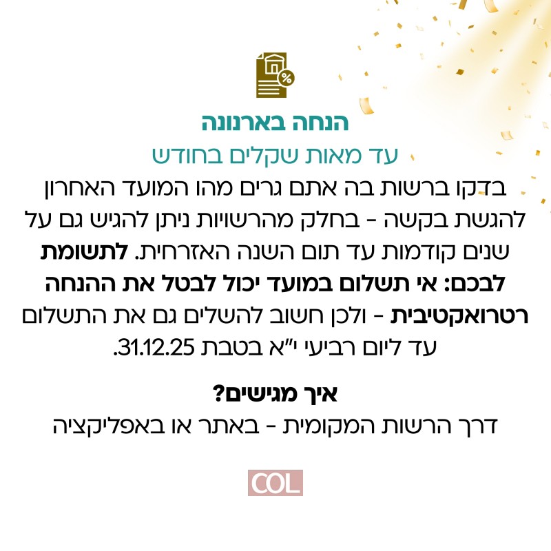 בדקו ברשות בה אתם גרים מהו המועד האחרון להגשת בקשה - בחלק מהרשויות ניתן להגיש גם על שנים קודמות עד תום השנה האזרחית. לתשומת לבכם: אי תשלום במועד יכול לבטל את ההנחה רארואקטיבית - ולכן חשוב להשלים גם את התשלום עד ליום רביעי י"א בטבת 31.12.25.