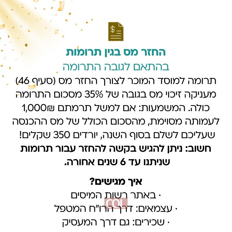 תרומה למוסד המוכר לצורך החזר מס (סעיף 46) מעניקה זיכוי מס בגובה של 35% מסכום התרומה כולה. המשמעות: אם למשל תרמתם 1,000₪ לעמותה מסוימת, מהסכום הכולל של מס ההכנסה שעליכם לשלם בסוף השנה, יורדים 350 שקלים! חשוב: ניתן להגיש בקשה להחזר עבור תרומות שניתנו עד 6 שנים אחורה.