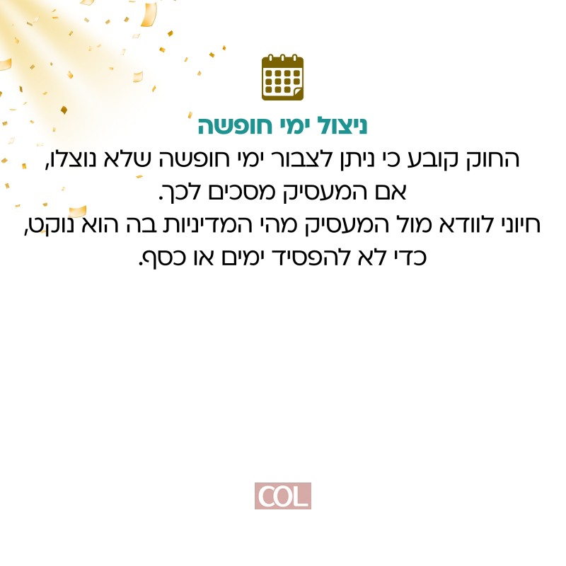 החוק קובע כי ניתן לצבור ימי חופשה שלא נוצלו, אם המעסיק מסכים לכך. חיוני לוודא מול המעסיק מהי המדיניות בה הוא נוקט, כדי לא להפסיד ימים או כסף.