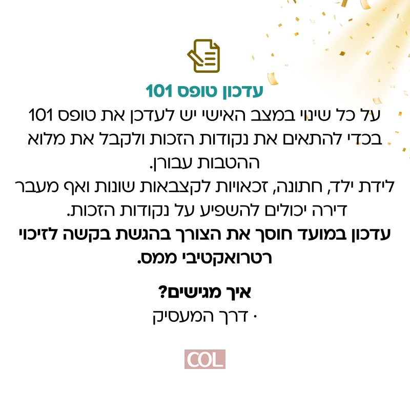 על כל שינוי במצב האישי יש לעדכן את טופס 101 בכדי להתאים את נקודות הזכות ולקבל את מלוא ההטבות עבורן. לידת ילד, חתונה, זכאויות לקצבאות שונות ואף מעבר דירה יכולים להשפיע על נקודות הזכות. עדכון במועד חוסך את הצורך בהגשת בקשה לזיכוי רטרואקטיבי ממס.