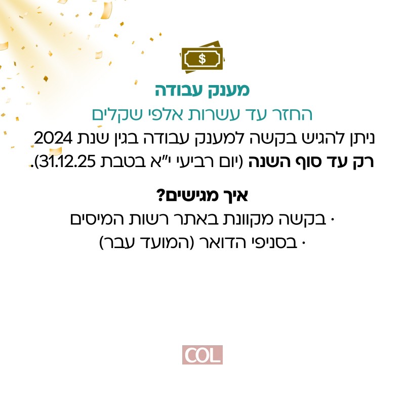 ניתן להגיש בקשה למענק עבודה בגין שנת 2024 רק עד סוף השנה (יום רביעי י"א בטבת 31.12.25).