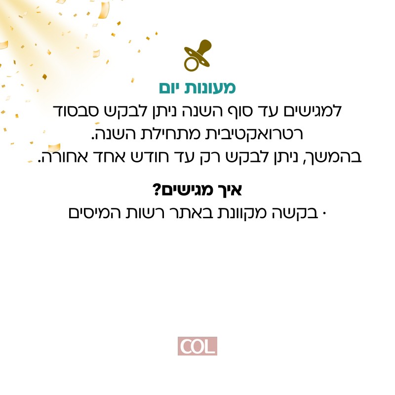 למגישים עד סוף השנה ניתן לבקש סבסוד רטרואקטיבית מתחילת השנה. בהמשך, ניתן לבקש רק עד חודש אחד אחורה.