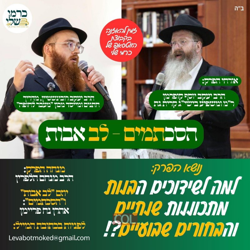בפרק מיוחד משולב של הפודקאסטים ״הסכתמים״ ו״לב אבות״ מבית כרמי שלי, בהנהלת הרב יוסי וולס, הרב מנחם הלפרין והרב נטע גערליצקי - מתארחים הרב יעקב יוסף קופרמן, ר״מ ומשפיע בישי״ג קרית גת ומדריך החתנים ומייסד מכון ״מעבר לחופה״, הרב יעקב רובינשטיין, לפרק מיוחד על הנושא שהכי חשוב בחייו של כל תמים, וכל בחורה, וכל הורה - הכנה אמיתית של הבחורים לשידוכים.