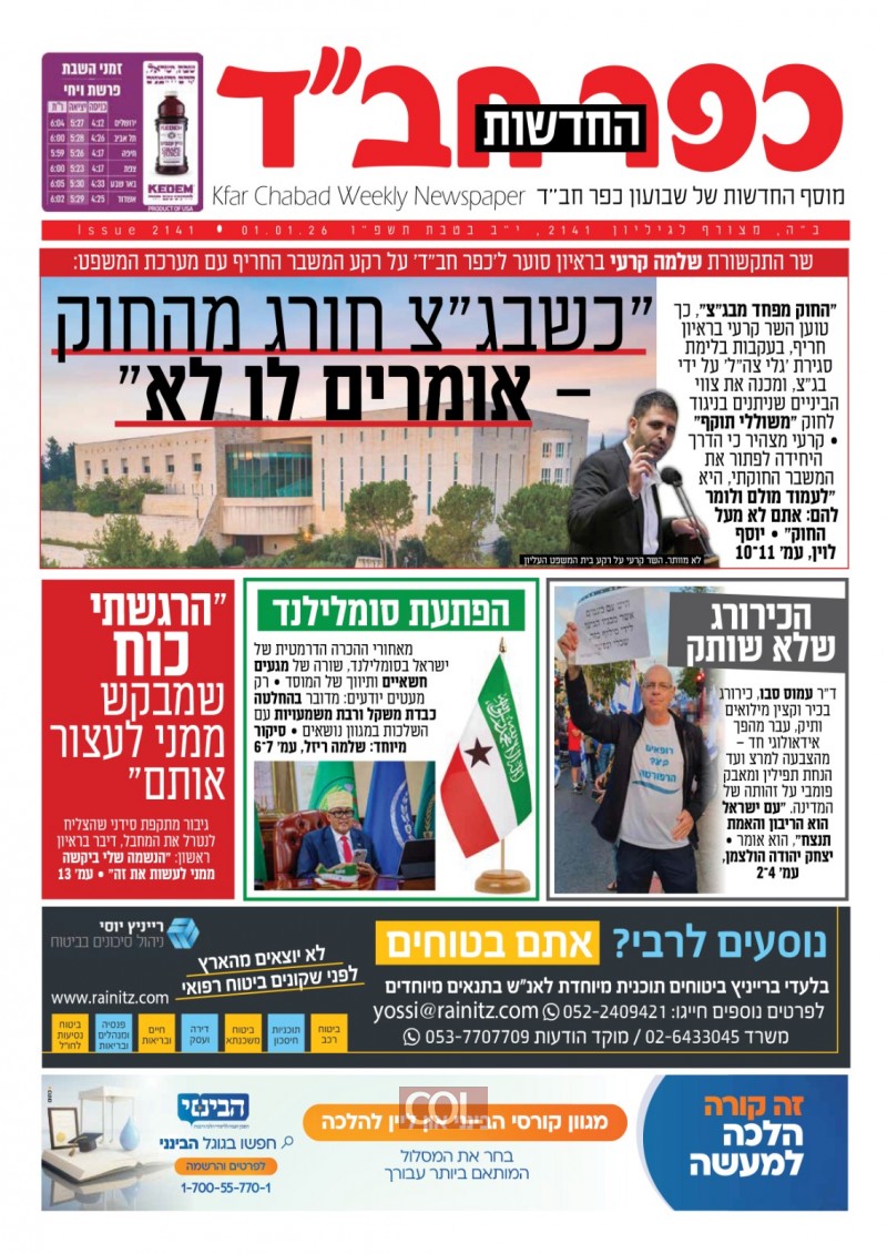 כותרות שבועון 'כפר חב"ד': ויחי - ה'תמים' החב"די שנפצע קשה בטבח בסידני וניצל בנס, מדבר בראיון ראשון ומטלטל עם אביו השליח על הרגעים הדרמטיים ונס ההצלה | מקושר מהרגע הראשון: בנו של המשפיע מסנהדריה הרב יונה סלפושניק ע"ה שכל חייו חי את התוועדות קבלת הנשיאות בה השתתף, שופך אור על דמותו | משה, מענדל הגיע! חשיפה על מסכת הקשרים העזה של גדולי החסידים הרב מענדל פוטרפס והרב משה וישצקי - במלאות 40 שנה לפטירתו | "לא האמנתי עד שבאתי לראות": כוכב הרשת דודי קפלר שחתם סבב תיעודים פופולריים מבתי חב"ד בעולם - סוגר את העדשה ופותח את הלב בשיחה מרגשת | במוסף 'נשימה': כתבה מיוחדת על דמותה הנדירה של הרבנית חיה שרה אבן ישראל שהלכה לעולמה והקשר עם הרבי | במוסף החדשות: שר התקשורת שלמה קרעי בראיון סוער | צפו בשערים