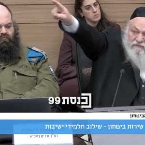 יו"ר יהדות התורה ח"כ יצחק גולדקנופף, לצד סא"ל אביגדור דיקשטיין החב"די, ראש תחום חרדים בענף כוח אדם בצה"ל, בדיון סוער בוועדת החוץ והביטחון בכנסת על חוק הגיוס (צילום: ערוץ 99)