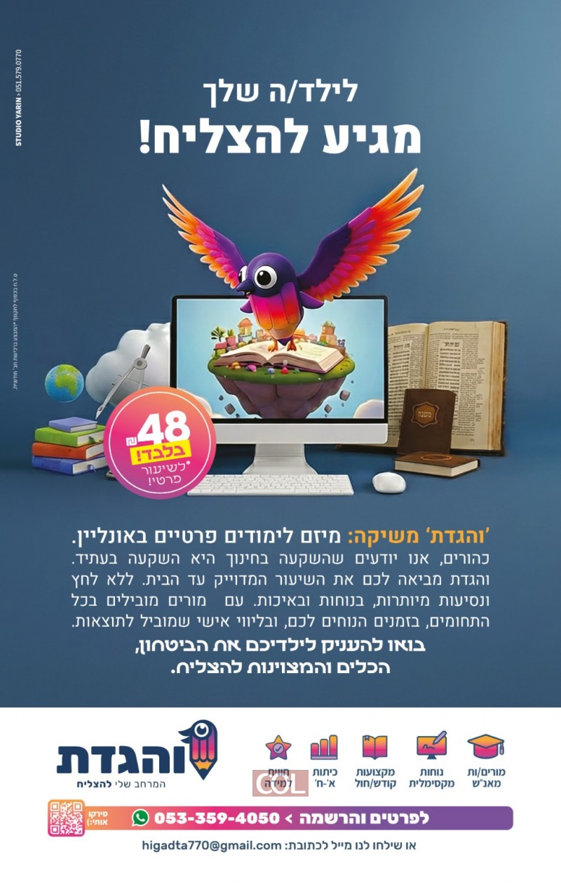 פרוייקט ״והגדת״ מציעה לילדים ולילדות מהארץ ומהעולם שיעורים פרטיים בנוחות מהבית במחיר סימלי מיוחד בכל נושא ובכל גיל על מנת לגרום לילד להצליח מתוך אהבה אמיתית ללימוד!