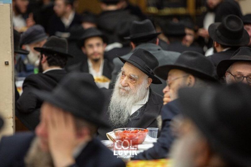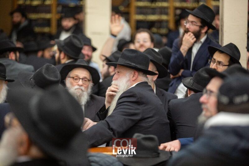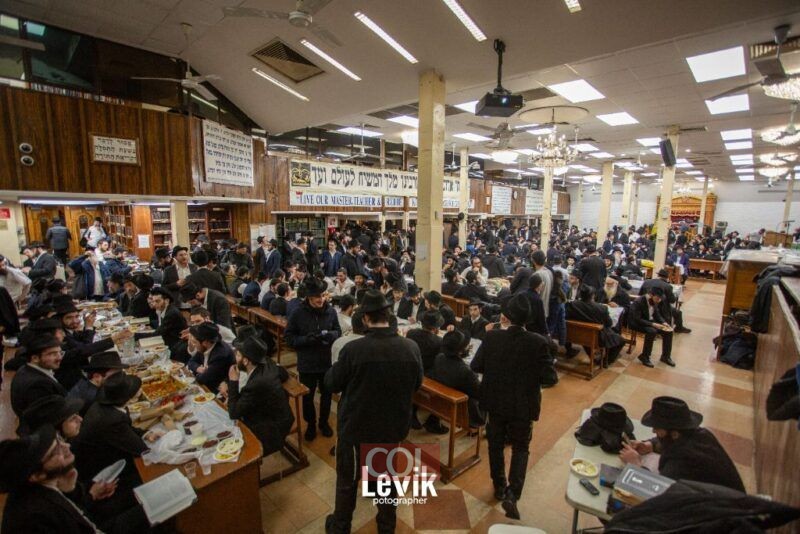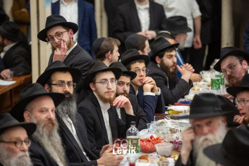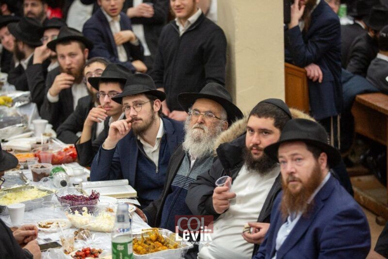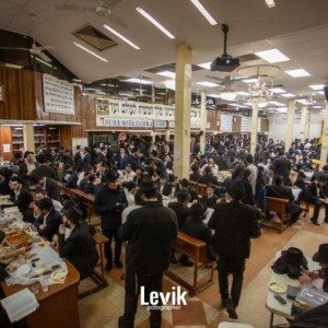 אנ"ש והתמימים חסידי חב"ד התוועדות ב'בית חיינו' 770 שבניו יורק לרגל יום ההילולא של כ"ק אדמו"ר הזקן ביום כ"ד בטבת, סביב שולחנות ערוכים (צילום: לוי'ק קרומבי)