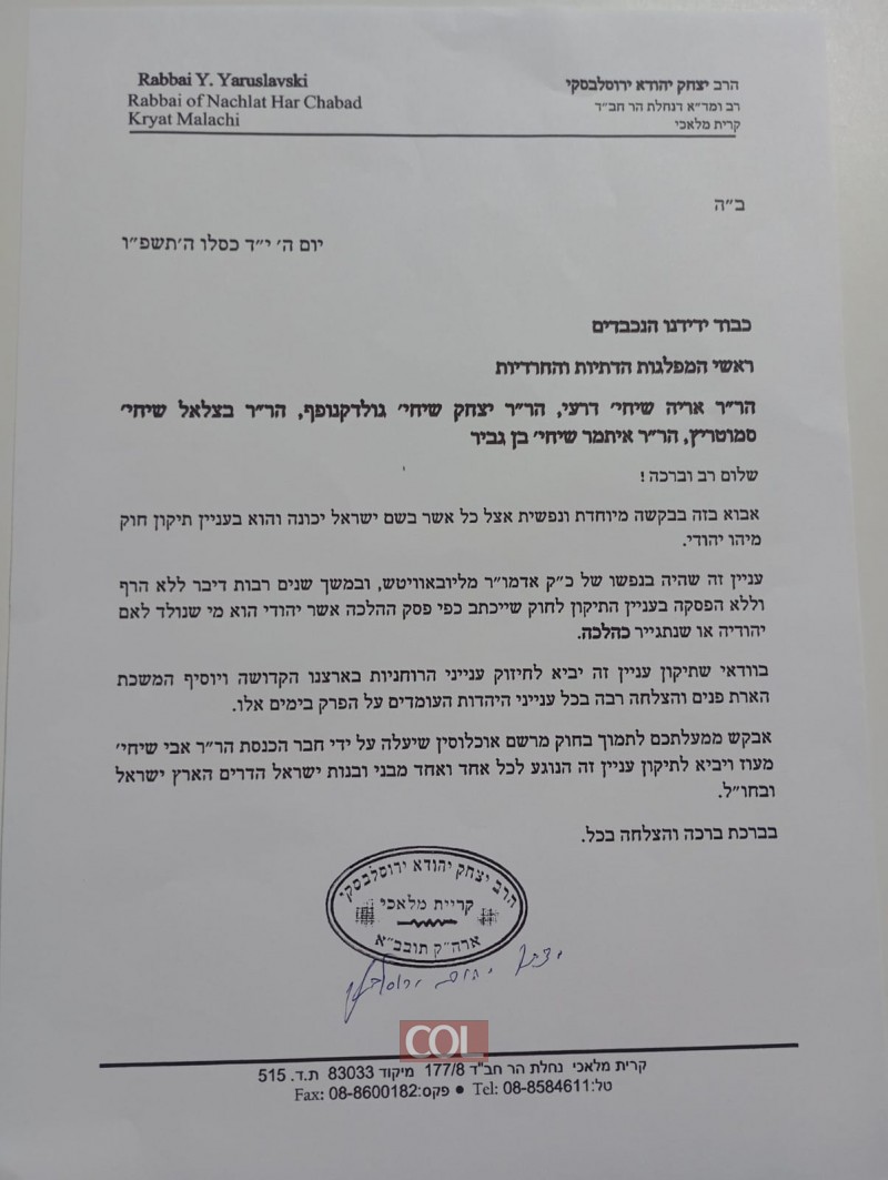 כך או כך, עם ההתגוששות הפנימית בסיעות הימין, נראה כי התיקון המיוחל לחוק 'מיהו יהודי', עליו הרבי זעק רבות, בושש בינתיים להגיע, וההתבוללות הנוראה מאי תיקון החוק, ממשיכה לעשות שמות בעם היהודי, בארץ ובחו"ל.