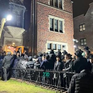 ברוכים הבאים הביתה: קבוצת נערי בר המצווה שהגיעו יחד לרבי בטיסת הפנסאים לתשפ"ו, עומדים נרגשים בכניסה ל-770 בשעת לילה מאוחרת