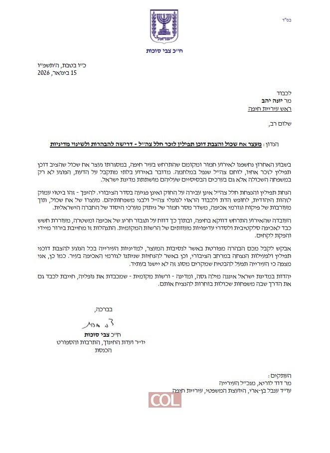 במכתב הפונה למר יונה יהב, ראש עיריית חיפה, טוען סוכות כי מדובר בפגיעה עמוקה במשפחה שכולה ובערכי היסוד של מדינת ישראל. לדבריו, הנחת תפילין והנצחת חלל צה”ל אינן עבירה על החוק, אלא ביטוי לזהות היהודית, לחופש הדת ולכבוד הראוי לנופלים ולבני משפחותיהם.