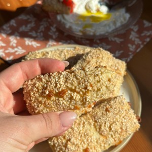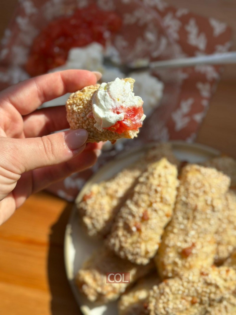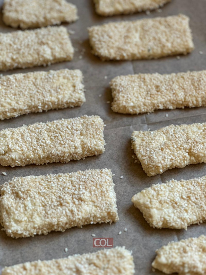 4. מטבילים כל מקל בביצה טרופה ומצפים בשומשום מכל הצדדים.