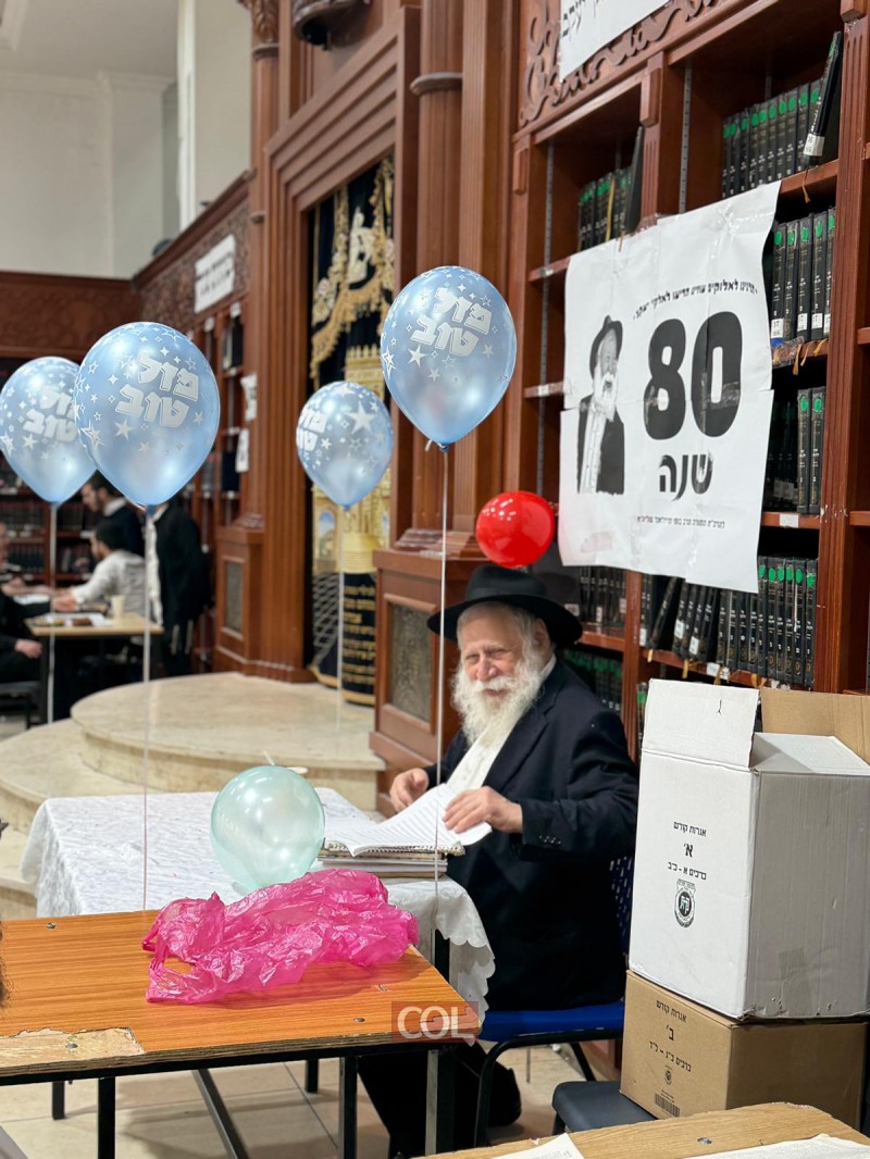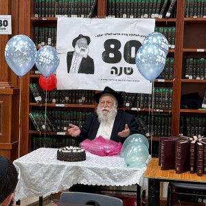 עם בלונים ועוגה: תלמידיו אוהביו של הגאון החסיד, הרב בומי פרינלנד שיחי', משפיע בישיבת 'תומכי תמימים' חב"ד בקרית-גת, חגגו לו הבוקר את יום-הולדתו ה-80 לאורך ימים ושנים טובות