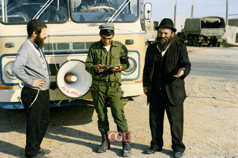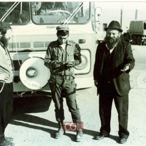 מבצע תפילין עם חיילי צה"ל בתעלת סואץ, תשל"א. מצד ימין נראה הרה"ח ר' מאיר פרידמן ז"ל מראשי פעילי צא"ח. מזהים מי החסיד משמאל? רמז: הקשר אקטואלי. לטובת הגולשים, בפנים מצורפת התמונה לאחר עיבוד מיוחד בצבע
