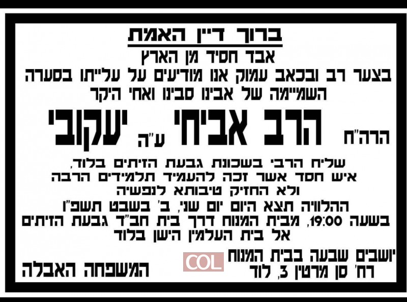 בצער רב התקבלה הידיעה המעציבה על פטירתו של הרב אביחי יעקובי ע"ה, שליח הרבי בגבעת הזיתים בלוד וחבר המועצה הדתית בעיר.