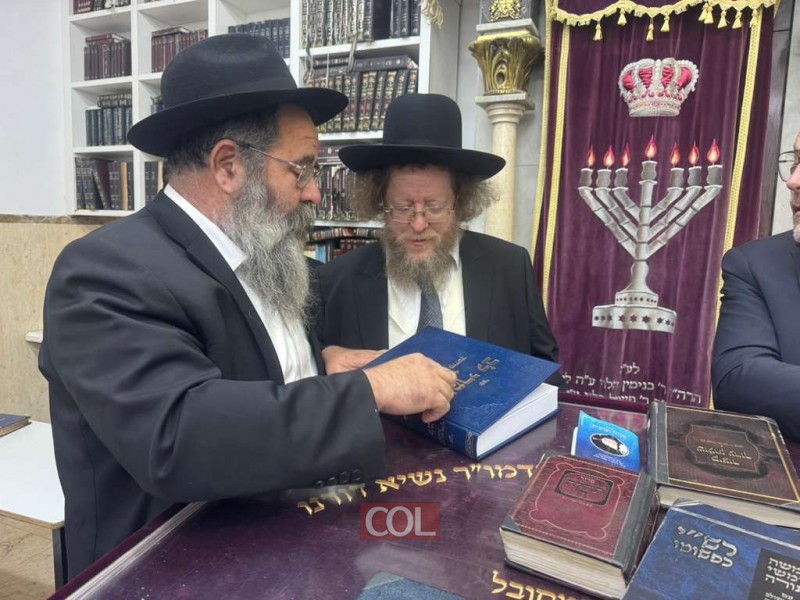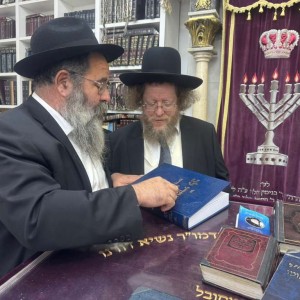 הרב שלום בער סורוצקין שליט''א, בשיחה עם מנהל כולל 'בית מנחם' הרב משה הורוביץ. הוא קיבל בנועם רב את הספר 'אמרי לב' - שיעוריו של הגה''ח הרב יהודה לייב שפירא שליט''א, ראש ישיבת ליובאוויטש במיאמי