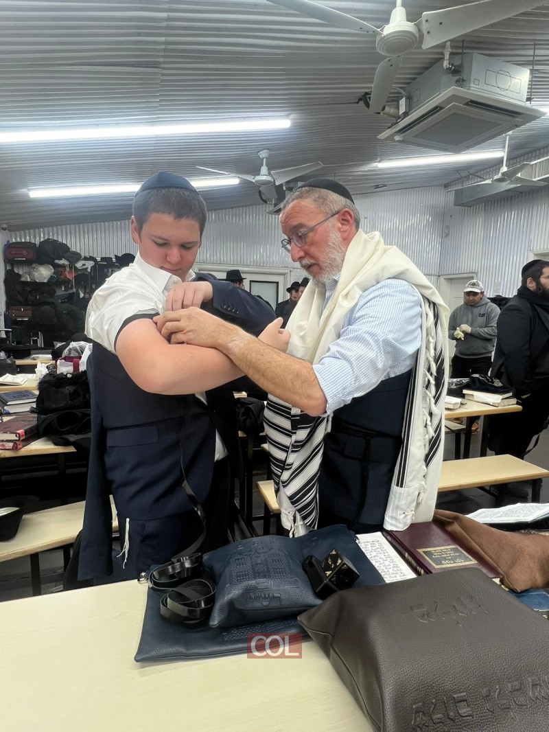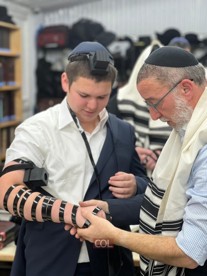 מזל טוב: בטענט הסמוך ל'אוהל' הקדוש של הרבי בניו-יורק, נערך מעמד הנחת תפילין לתמים חיים אריה בארנס, בנם של ר' אברהם ונחמה בארנס מכפר חב"ד
