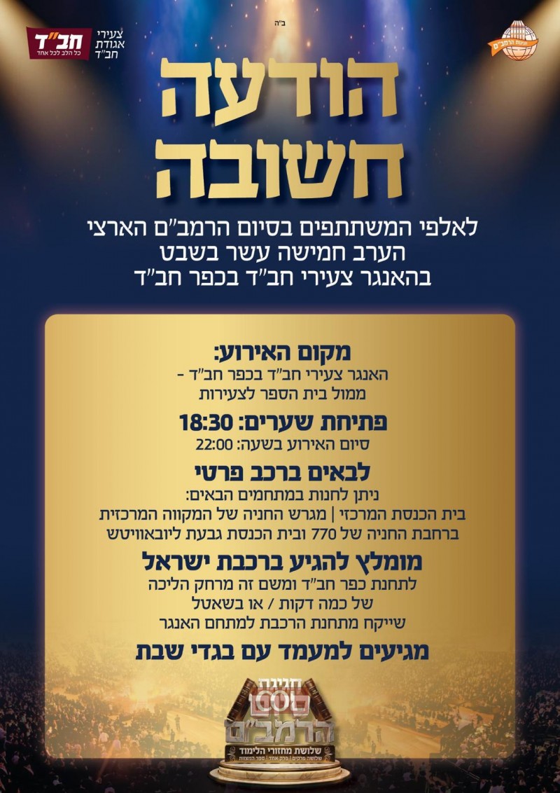 הערב יתקיים בהאנגר הענק שהוקם בכפר חב"ד מעמד סיום הרמב"ם | בהפקת האירוע ממליצים להגיע ברכבת ישראל. הבאים ברכב פרטי יופנו על ידי סדרנים לחניונים שהוכשרו לקראת האירוע. במטה הרמב"ם שבצאגו"ח מבקשים להגיע בבגדי שבת