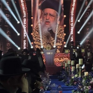 הראשון לציון והרב הראשי לישראל הרב דוד יוסף נושא דברים ועורך את ה'סיום' במעמד המרכזי של סיום הרמב"ם בהנאגר הענק בכפר חב"ד