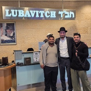 שורד השבי יוסף חיים אוחנה וחברו ניצול הטבח בנובה דניאל שרעבי - בדוכן חב"ד בנמל התעופה על שם בן גוריון, עם חברו של אוחנה מילדות התמים פישי מישולובין מנחלת הר חב"ד