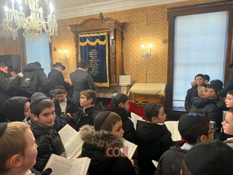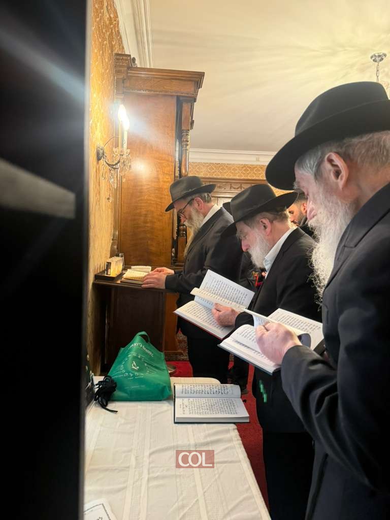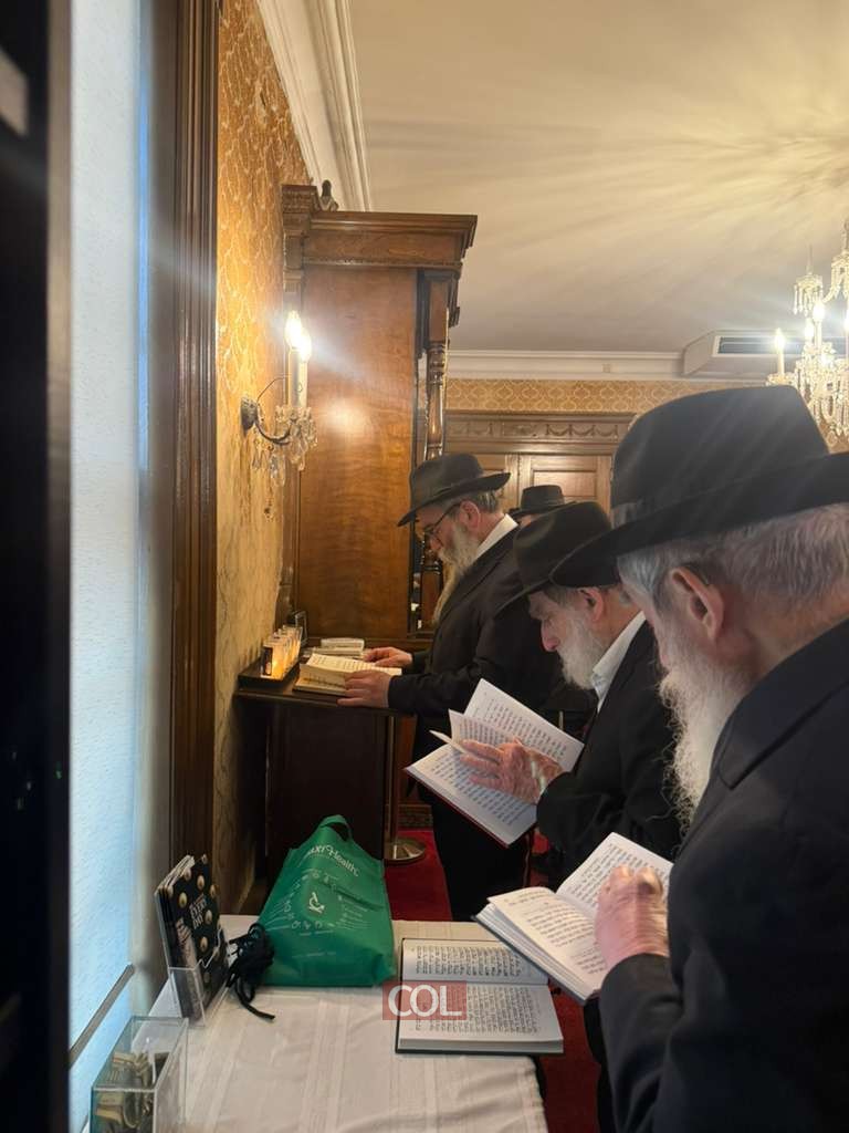הרב חיים שאול ברוק - מנהל ועד הנחות בלשון הקודש, עומד חזן בעמוד התפילה, במניין מנחה שנערך בבית הרבי והרבנית ברחוב פרזידנט, לרגל היארצייט של הרבנית ע"ה