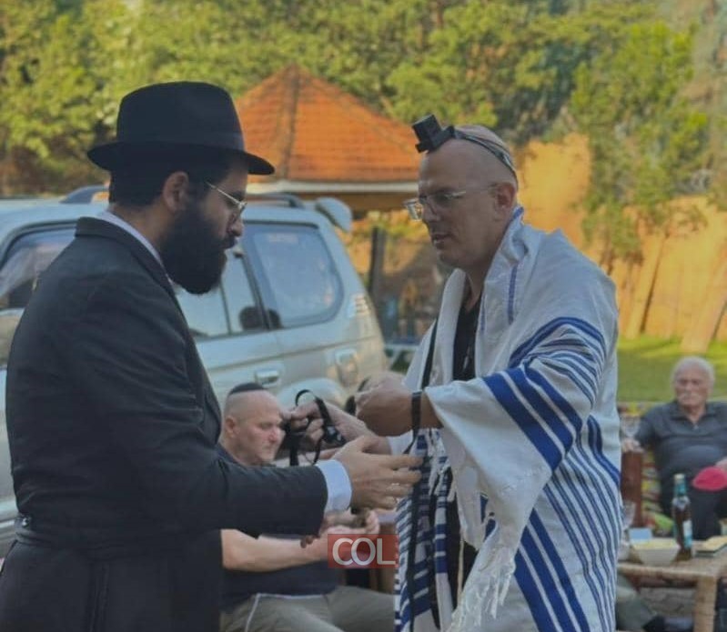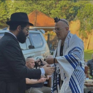 רגע לפני שגזר את שערות הראש לבנו לרגל שמחת החלאק'ה: שליח הרבי באוגנדה - הרב מוישי רסקין, מנצל את המפגש עם חברי הקהילה להנחת תפילין וזכות במצווה