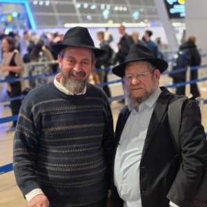 עסקני חב"ד בנחלת הר חב"ד שקריית מלאכי, ר' למי הרשקופ ור' חיים שטיינר, בדרכם להתברך אצל הרבי לרגל יום הולדתם