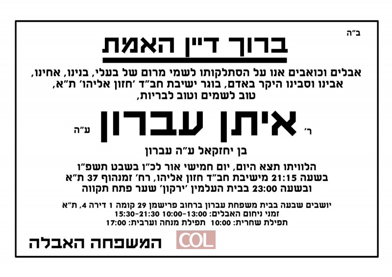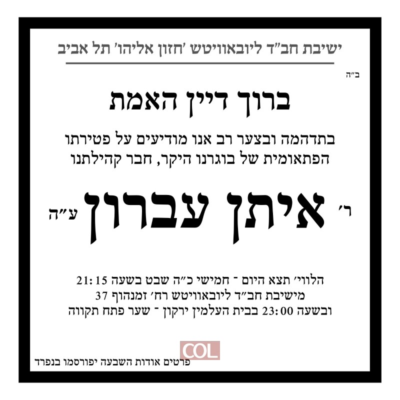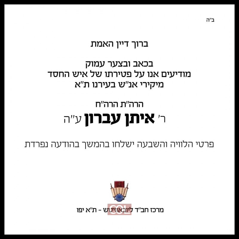 בצער רב מתקבלת הבשורה על פטירתו של ר' איתן עברון, בוגר ישיבת חב"ד חזון אליהו מתל אביב, ומחברי קהילת הישיבה | הלווייתו התקיימה ביום חמישי והוא נטמן בבית העלמין ירקון שער פתח תקווה | שבעה יושבים בביתו ברחוב פרישמן 29 בתל אביב, קומה 1 דירה 4 | שעות הניחום והתפילות במודעה המצורפת. יהי זכרו ברוך