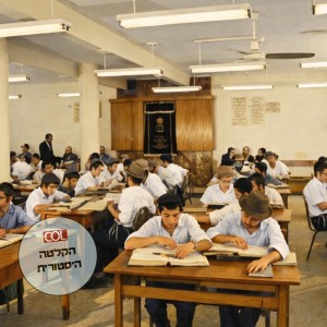 זאל הישיבה המרכזית בכפר חב"ד, בימים ההם (עם עיבוד צבע). ארכיון ר' שמואל ריבקין, COL