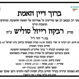 בצער רב התקבלה הידיעה על פטירתה של האשה החשובה והצנועה, מרת רבקה רייזל סוליש ע"ה, אשת חבר להרה"ח ר' ברוך סוליש שיחי' - מוותיקי קהילת חב״ד בעמנואל