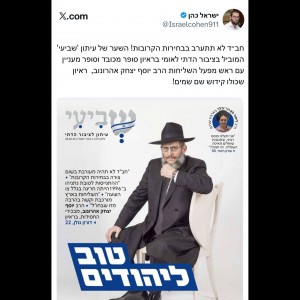"חב״ד לא תתערב בבחירות הקרובות": שער עיתון 'שביעי' המוביל בציבור הד"לי בראיון מכובד עם ראש מפעל השליחות הרב יוסף יצחק אהרונוב, ראיון שכולו קידוש שם שמים!" (ישראל כהן)