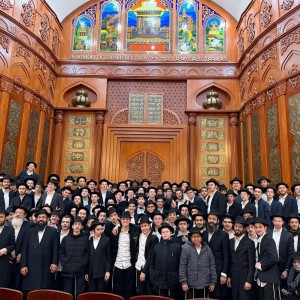 תלמידי ישיבת תומכי תמימים באלעד, שנסעו לחצרות קודשנו, בביקור בבית הכנסת הגדול 'בוכרים סנטר' של העדה הבוכרית בקווינס, עם שלוחי הרבי במקום, שם התארחו למלווה מלכה
