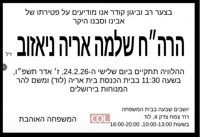 בצער רב מתקבלת הידיעה על פטירתו של הרה"ח הרב אריה ניאזוב ע"ה, מחשובי חסידי חב"ד בלוד | ההלווייה התקיימה היום ברחבת בית הכנסת "בית אריה" בשיכון והמשיכה להר המנוחות בירושלים