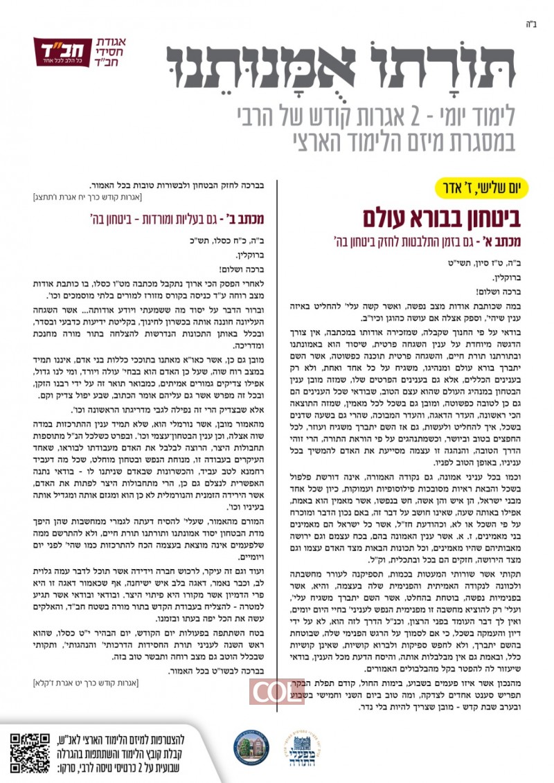 איזה אות חסרה במילה דאגה? וכמה הרבי לא פסק מלעורר על בטחון בהשם | האזינו כעת למשפיע הרב מנחם דוברוסקין בשיח "ניצוצקאסט" (2 דקות) על לימוד האגרת היומי. במסגרת מיזם הלימוד הארצי של אגודת חסידי חב"ד תּוֹרָתוֹ אֻמָּנוּתֵנוּ לקראת י"א ניסן