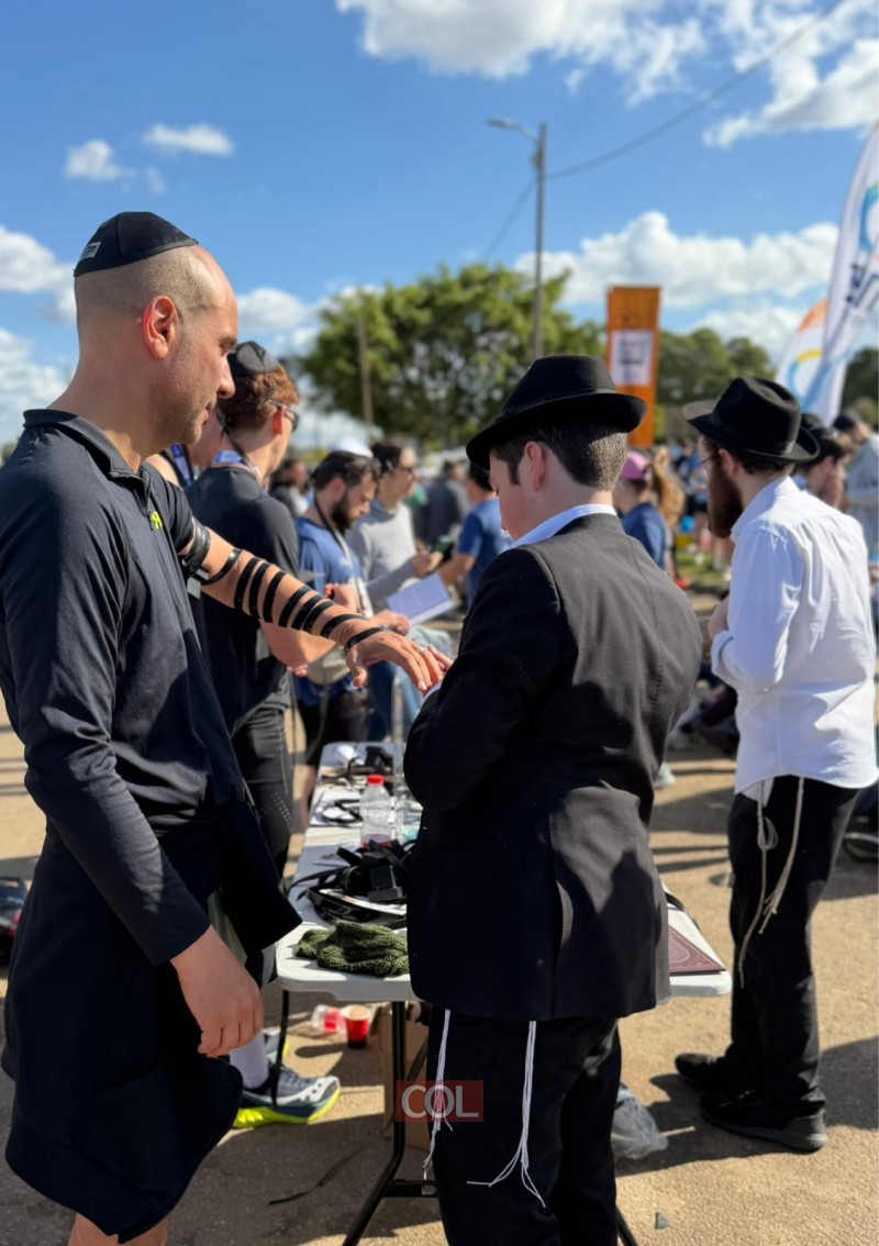 מאות יהודים מכל רחבי הארץ, בהם רצים, משפחות ועוברי אורח, עצרו את מרוץ החיים לרגע של הנחת תפילין, קבלת ערכות נש״ק והתחזקות באמונה.