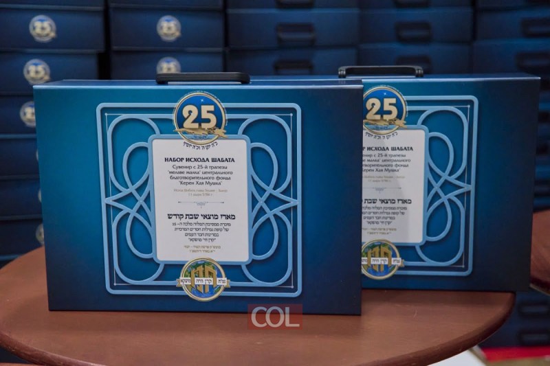 הפתעה מיוחדת ציפתה לכל המשתתפים, שקיבלו עם יציאתם בסיום הערב החגיגי מארז מיוחד ומקורי לכבוד מוצאי שבת קודש, הכולל: מגש, גביע, פמוט עם נר הבדלה, צנצנת בשמים, שתי כוסות לקיום 'חמין במוצאי שבת מלוגמא', שני פמוטים להדלקת נרות לכבוד מוצאי שבת, קופת צדקה, וספרון בלשה"ק וברוסית שנכתב ונערך במיוחד בידי מנהל הגמ"ח, ובו הדרכה מופרטת עם התפילות, ההלכות וההנהגות למוצאי שבת.
