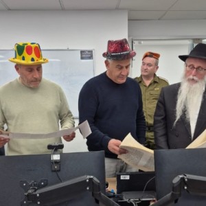 השליח הראשי בבאר יעקב הרב בקרמן קורא את המגילה בבור החמ"ל של העיריה, עם ראש העיר מר ניסים גוזלן וצוות החמ"ל