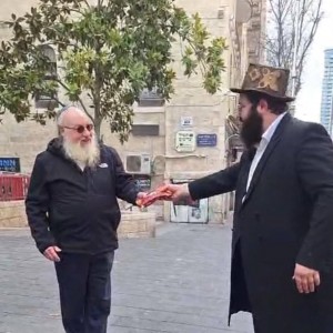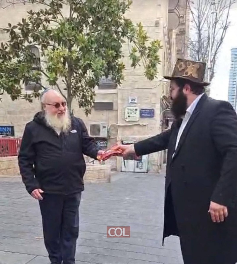 נהפך להם לשמחה: יונתן פולארד, שהקריב את חייו למען ארץ הקודש, מקבל משלוח מנות ברחוב יפו בלב ירושלים, בפורים דפרזים, מהשליח באזור הרב ישראל אריה לייב קעניג