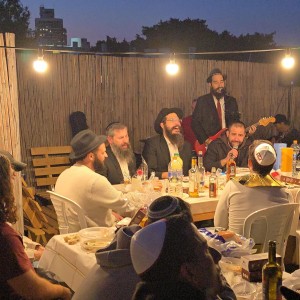 ליד מרחב מוגן: משתה פורים מושקע על גג בית חב"ד לסטודנטים וצעירים בתל אביב, בראשות השליח הרב עדי אלפנט, בשמחה גדולה וחסידית עם האמן ר' ברק גרוסברג ולהקתו