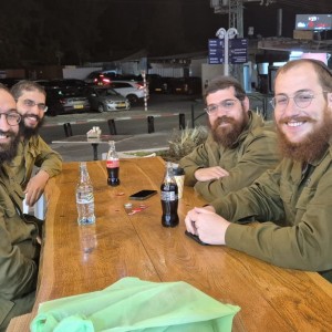 מנוחת הלוחמים: ארבעה משלוחי הרבי ביהוד שמגויסים לצה"ל בימים אלו בשל מלחמת 'שאגת הארי' נפגשו בבסיס הצבאי ודנו על תכניות הבית חב"ד לקראת חג הפסח תשפ"ו