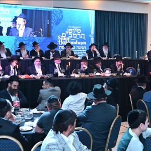 את בימת הנשיאות פיארו ראשי ישיבות ורבני קהילות נכבדות שדיברו כל אחד בתורו הוא על המהפכה הגדולה של הרבי בתקנת לימוד הרמב״ם היומי על כל מסלוליו.