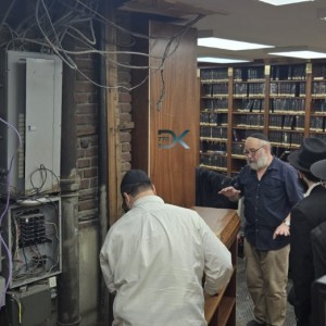 ממשיכים בחידוש ארונות הספרים בכניסה לבית המדרש הגדול של 770 | צילום DK
