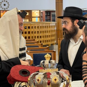 הרב והשליח הראשי לרוסיה הרב בערל לאזאר בעלייה לתורה ביום שני בבית הכנסת מרינה ראשצ'ה במוסקבה, לרגל הולדת נכדתו, בת לחתנו הרב מנחם מענדל ווילנסקי